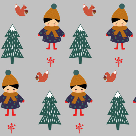 灰色の背景に冬の森のシームレスなパターンで歩くリスかわいい女の子 クリスマス北欧スタイル自然イラスト テキスタイル 壁紙 ファブリックの赤ちゃんデザインで冬の森 のイラスト素材 ベクタ Image
